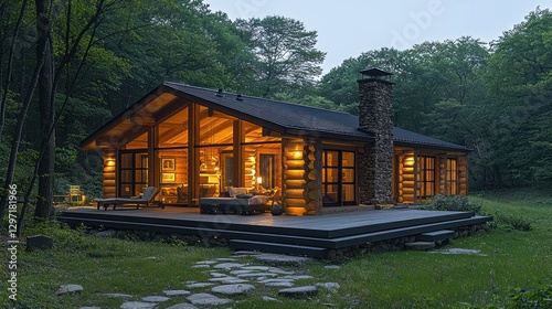 A cozy illuminated log cabin surrounded by verdant forest and meadow