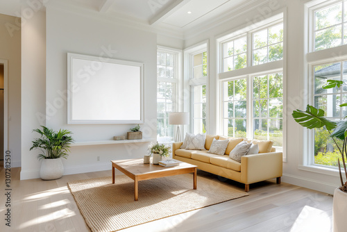A cozy living room and a blank photo frame