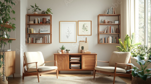 A cozy living room featuring mid century modern furniture, including two armchairs and wooden cabinet. space is adorned with plants and books, creating warm and inviting atmosphere