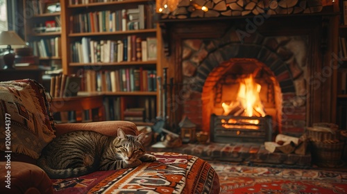 A cozy living room with a cat lounging by a warm fireplace surrounded by books.