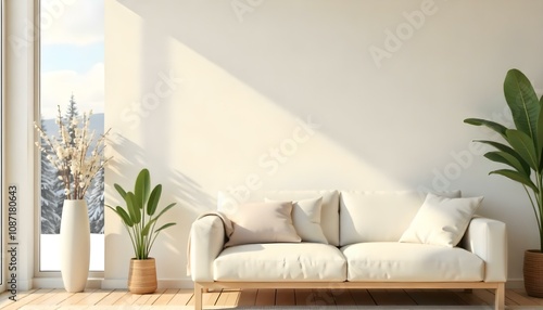 A cozy living room with a white sofa, wooden furniture, and a large window overlooking a snowy landscape