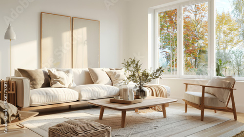 A cozy living room with light wooden furniture, large windows, and warm atmosphere. space features soft cushions, stylish coffee table, and natural decor elements, creating serene environment