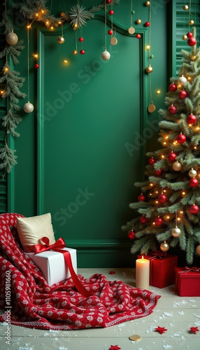 A cozy lounge area featuring a beautifully decorated Christmas tree, stylish red and green accents, and soft textures that create an intimate and cheerful holiday environment.