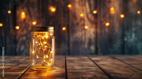 A cozy mason jar filled with warm fairy lights set against a rustic wooden background with soft bokeh