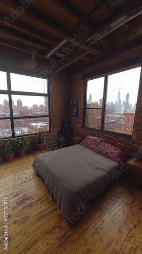 A cozy, modern bedroom features a bed with simple linens, surrounded by plants. Large windows showcase a cloudy urban skyline, enhancing the loft's charm