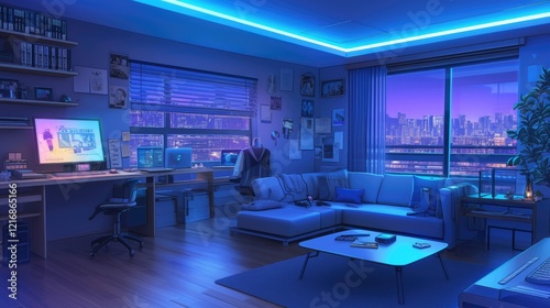 A cozy, modern home office with a city view at dusk, featuring ambient lighting and tech setup.