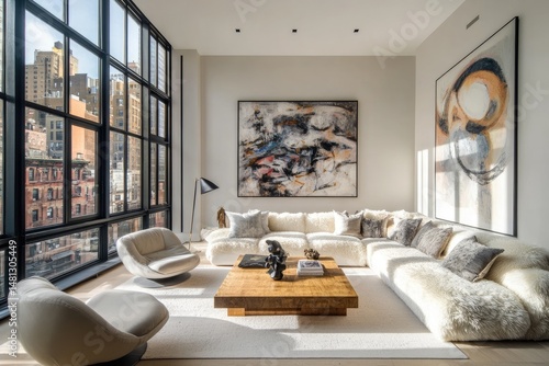 A cozy. modern living room featuring a plush sofa and stylish armchairs. with large windows showcasing a city skyline in the background. perfect for interior design inspiration