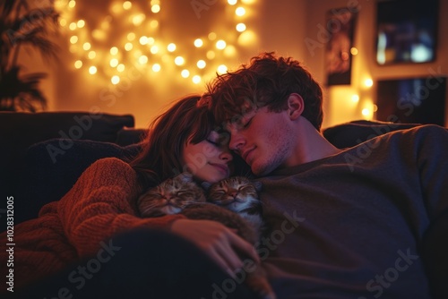 A cozy moment shared by a couple embraced on a couch. Soft lights create a warm atmosphere. Their pet cat relaxes between them. Perfect for love and comfort themes. Generative AI