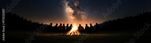 A cozy night setting with silhouettes around a glowing campfire, perfect for evoking warmth and connection in outdoor adventures.