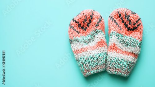 A cozy pair of woolen mittens resting on a light teal background, perfect for chilly winter days and outdoor activities