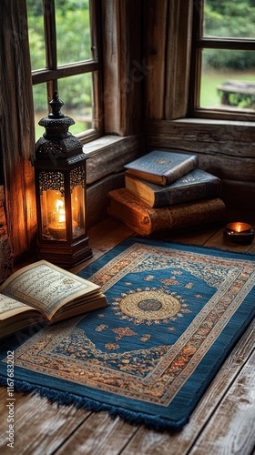 A cozy reading nook with a lantern, books, and a patterned rug by the window.
