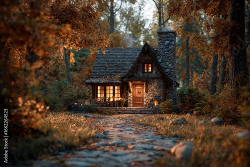 A cozy rustic cabin nestled in autumn woods at dusk, warm light glowing from windows, surrounded by colorful leaves, a path leading to the inviting front door.