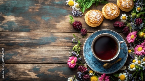 A cozy scene featuring a cup of coffee surrounded by flowers and pastries.