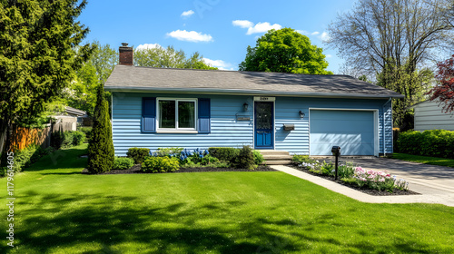 A cozy suburban home with freshly painted blue siding, lush green lawn, and colorful flowerbeds under a bright blue sky