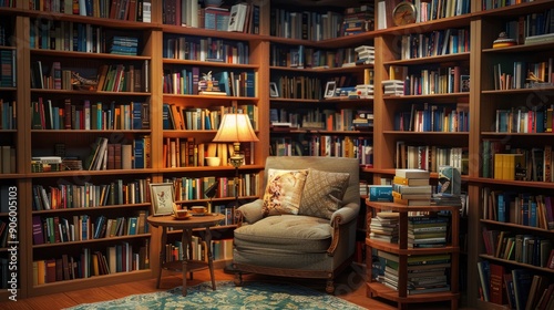 A cozy suburban reading nook with a comfortable armchair, a small table with a lamp, and bookshelves filled with books.