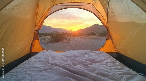 A cozy tent interior framing a stunning sunset over desert landscapes, inviting serenity and outdoor adventure.