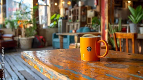 A cozy timber table is occupied by an orange mug with a graphic current emblem on its side