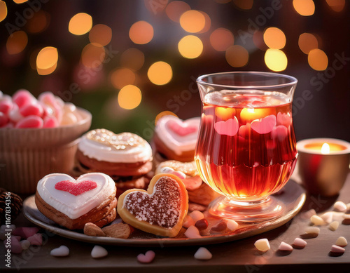 A cozy Valentine's Day scene features a glass of red herbal tea surrounded by heart-shaped cookies and candies with warm bokeh lights in the background.