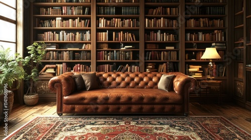 A cozy vintage-style room with a tufted leather sofa, a Persian rug, and a classic bookshelf