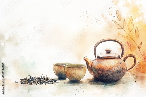 A cozy watercolor composition showcasing a rustic, hand-painted teapot alongside two