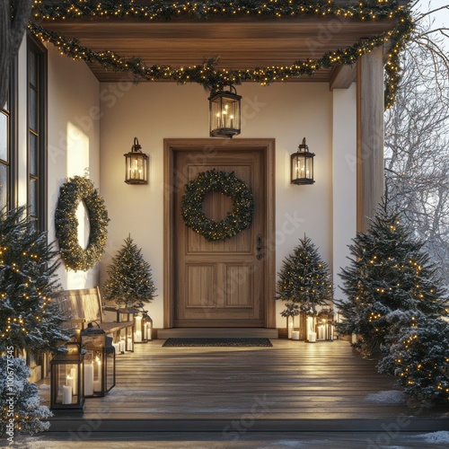 A cozy winter entrance adorned with festive wreaths, trees, and glowing lanterns, creating a warm holiday atmosphere.