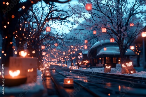 A cozy winter scene featuring glowing lanterns lining a snowy street, where gently falling snowflakes and warm lights create a magical and serene atmosphere at dusk.