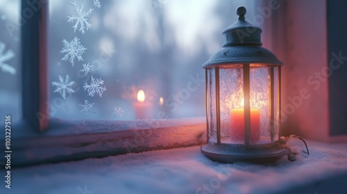 A cozy winter scene with a lantern glowing warmly on a snow-covered windowsill.