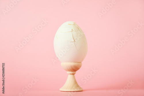 A cracked egg on a pink background close-up and copy space. One egg, easter concept, smash