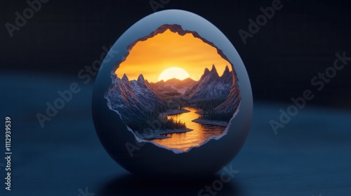 a cracked egg with a glowing miniature world inside, featuring mountains, rivers