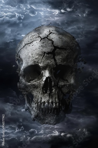 A cracked skull floats against a stormy, dark sky with clouds. The image has a haunting, eerie atmosphere.