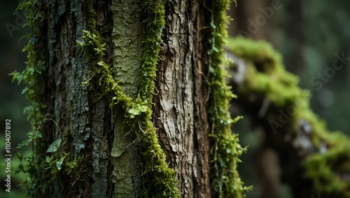 A cracked vine with rough, moss-covered texture symbolizing endurance.