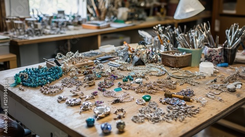 A craft table covered in handmade jewelry, beads, and silver wire in a workshop setting. Copy space.