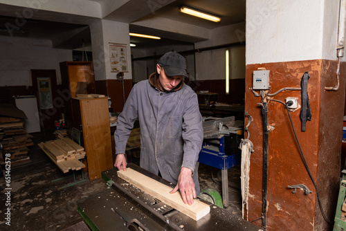 A craftsman works on woodworking machines and saws in a furniture workshop