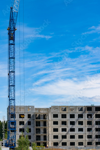 A crane over a house under construction against the blue sky