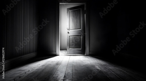 A creaking wooden door stands ajar at the end of a dimly lit hallway in a deserted, dilapidated house, evoking a chilling film noir horror atmosphere.