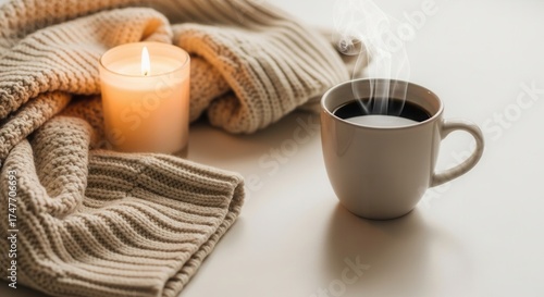 A cream knitted textile a glowing candle and a steaming beverage in a mug resting on a light surface