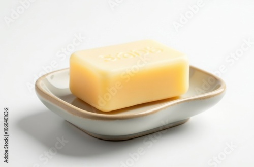 A creamy bar of soap rests on a curved dish, highlighting its smooth texture and soft color in a bright and uncluttered environment