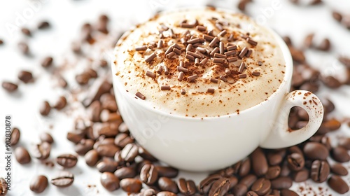 A creamy coffee topped with chocolate sprinkles in a white cup, surrounded by scattered coffee beans, Ideal for use in coffee shop promotions, blogs, and culinary articles about beverages,