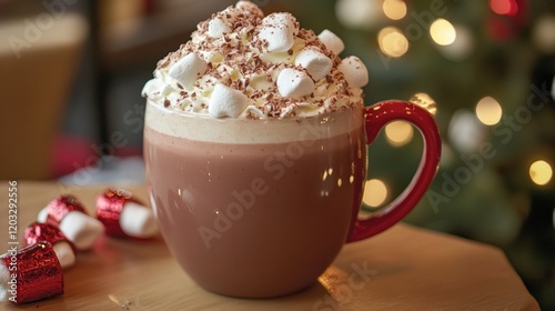 A creamy hot chocolate topped with whipped cream, marshmallows, and a sprinkle of cocoa