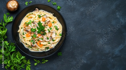 A creamy pasta dish garnished with fresh herbs, featuring colorful vegetables and served in a black bowl against a dark background.
