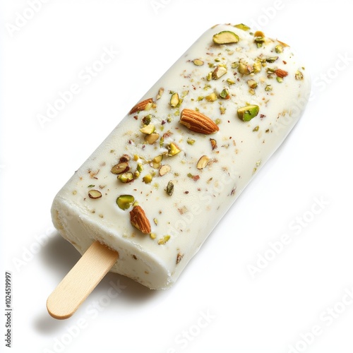 A creamy white kulfi ice cream bar sprinkled with chopped pistachios and almonds served