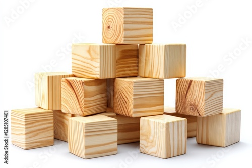 A Creative Arrangement of Natural Wooden Building Blocks Stacked in Various Positions Forming a Pyramid Shape on a White Background