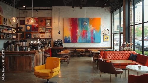 A creative coffee shop with eclectic loft decor, featuring mismatched furniture, colorful abstract art, and quirky decor. The bright, airy space is bathed in natural light, creating a lively,