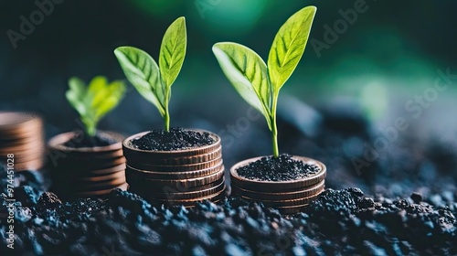 A creative concept of business growth with plants growing out of coins, symbolizing sustainable business practices.