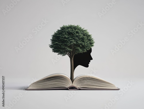 A creative concept showing a book with a tree growing from it, symbolizing knowledge and growth in a calming environment.