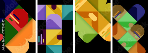 A creative display of colorful geometric shapes including rectangles and triangles in tints and shades on a black background, showcasing symmetry and artistic patterns with a pop of electric blue