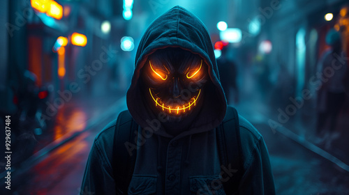 A creepy man with neon eyes walks through the darkness