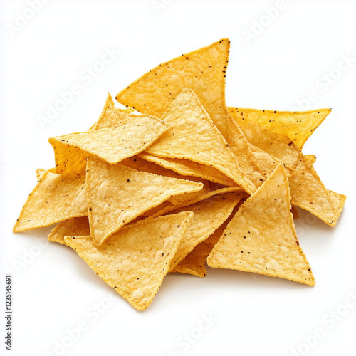 A crisp and golden stack of Mexican tortilla chips placed on a clean white background, showcasing their crunchy texture and authentic flavor. These classic corn chips are perfect for snacking