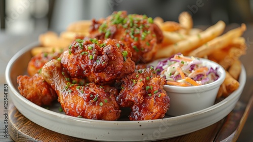 A crispy fried chicken bucket with golden brown pieces, served with coleslaw and fries