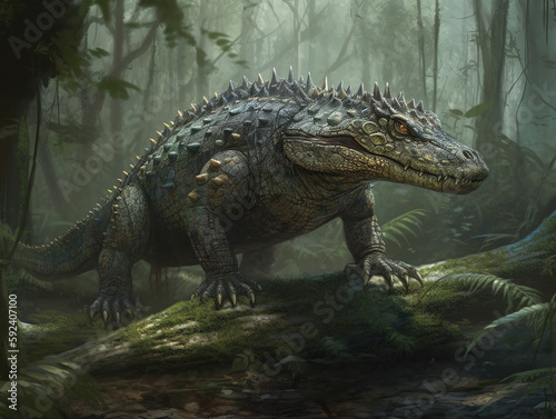 A crocodile hybrid walking in the forest, fantasy concept art. Generative AI